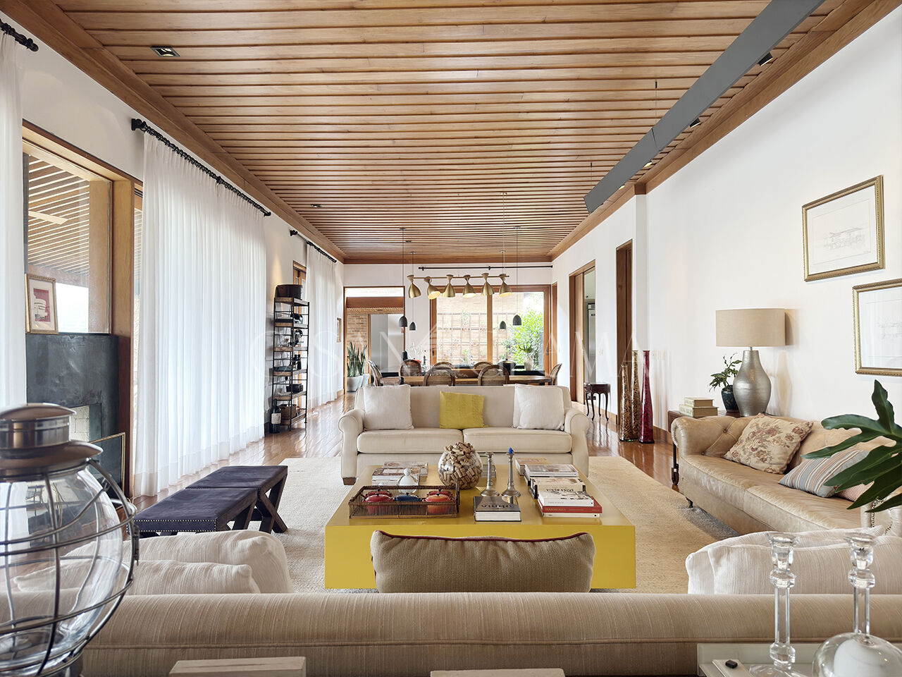 Ofereço espaços acolhedores, com 4 salas amplas que se entrelaçam em uma dança de luz natural, criando ambientes perfeitos para reunir quem você ama. Minhas lareiras aquecem as noites frias, enquanto o ar-condicionado nas suítes garante o frescor nos dias quentes. No espaço de lazer, a piscina aquecida por placas solares, a sauna seca e o meu gourmet com forno de pizza e churrasqueira esperam para oferecer experiências memoráveis.