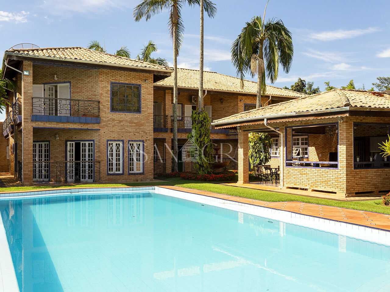 Deixe-se envolver pela clássica elegância do meu espaço de lazer, onde o sofisticado espaço gourmet e a piscina de design tradicional se fundem em harmonia com o exuberante paisagismo que abraça toda a minha extensão.